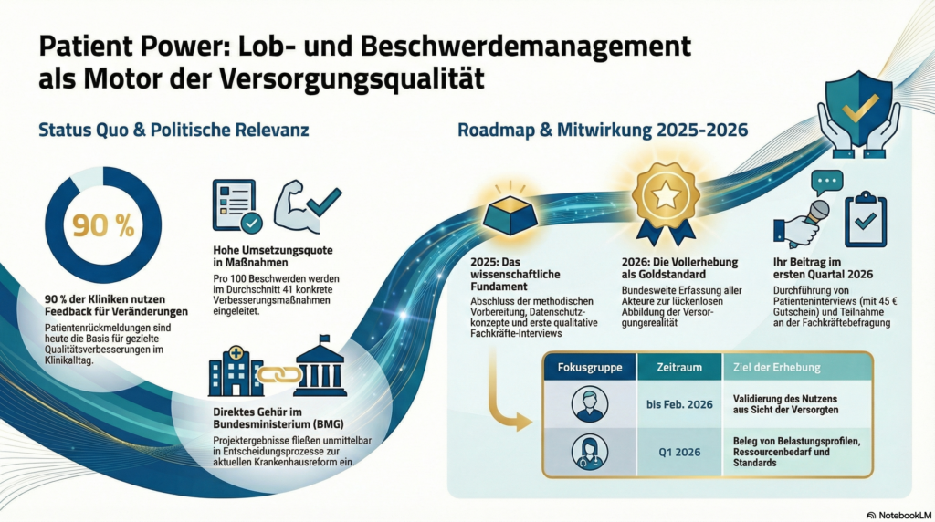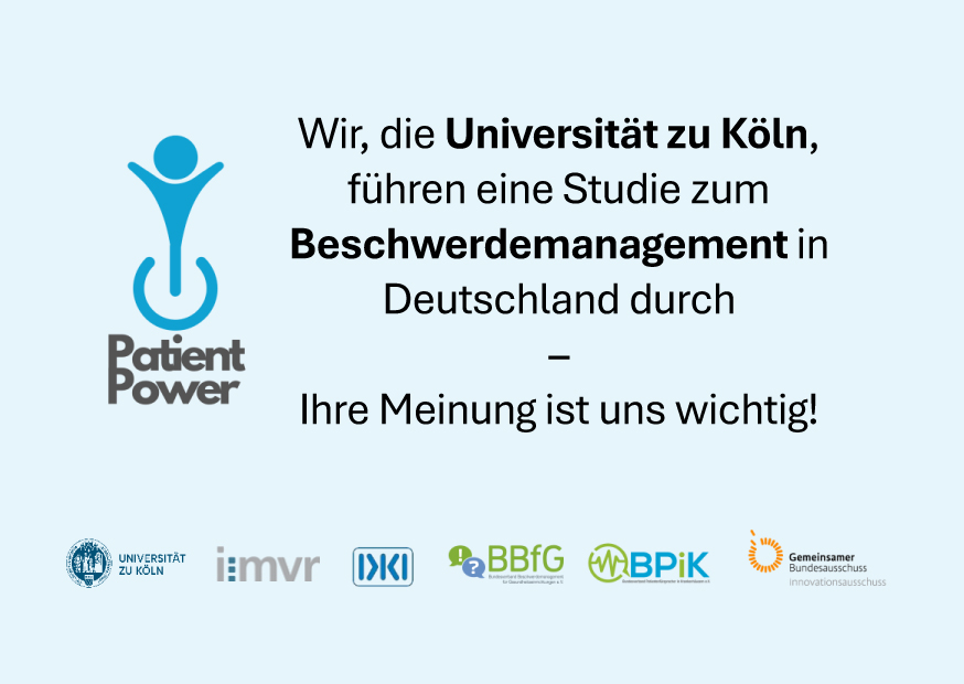 Um die­se Rele­vanz jedoch dau­er­haft in der Gesund­heits­po­li­tik und gegen­über Kran­ken­haus­trä­gern abzu­si­chern, bedarf es mehr als inter­ner Sta­tis­ti­ken. Das For­schungs­pro­jekt Pati­ent Power – Pati­ent-Empower­ment durch Pati­en­ten­für­spra­che und Beschwer­de­ma­nage­ment im Kran­ken­haus schafft hier­für die not­wen­di­ge wis­sen­schaft­li­che Evi­denz.